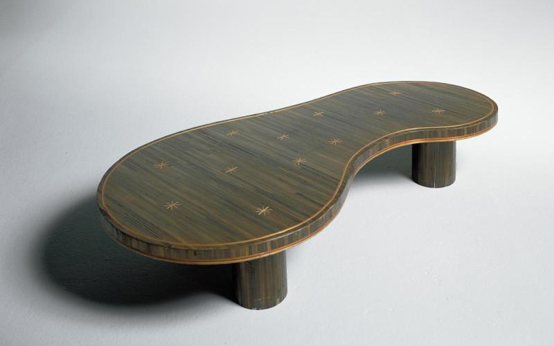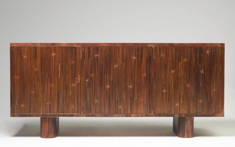 Dans les années 1950, Jean Royère (1902-1981) réalise pour une clientèle aisée du mobilier à base de bois, de tôle perforée et de marqueterie de paille. L’ensemble conçu pour la chambre du chanteur Henri Salvador en est un exemple des plus remarquables.