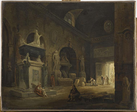 A gauche : Hubert Robert (1733-1808), La salle d’introduction du musée des Monuments français entre 1795 et 1801, Paris, Musée du Louvre.