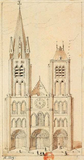 A droite : Façade de la basilique de Saint-Denis après les travaux de restauration (2012-2015).