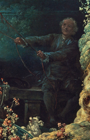 Mais regardons maintenant ce qui se passe dans la partie basse du tableau : à droite, dans l’ombre de l’arbre, un homme fait se balancer madame à l’aide de deux cordes. Il la regarde tendrement, l’air tranquille, assis sur un banc. C’est sans aucun doute son mari, le fameux évêque de la commande, remplacé ici par un homme en civil (pour éviter que cela ne nuise à la carrière du peintre). Cet homme, si innocent, n’a vraisemblablement aucune idée de ce qui se trame devant lui ! En effet, il ne voit pas qu'un autre personnage est caché dans les buissons devant. La jeune femme sait très bien qu’il est là ; c’est d’ailleurs à lui qu’elle lance sa chaussure délibérément, dans un geste sensuel. L’homme, ayant “pleine vue sur les jambes de cette belle enfant”, semble étourdi, comme hypnotisé (il faut savoir que les jambes, en particulier les chevilles, avaient une connotation très érotique au XVIIIe siècle). Le caractère secret de la scène qui se déroule est appuyé par la figure de l'amour, au dessus, qui met un doigt devant sa bouche, assurant la confidentialité. Pas de doute possible : c’est l’amant de la demoiselle, Saint-Julien lui-même, et son mari trompé. Pas si heureux que ça, ce hasard !